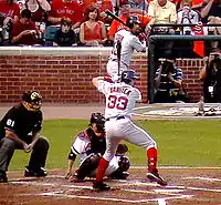 In 2004, Varitek compiled a career-high .296 batting average with 18 home runs and 73 RBI. During a nationally televised game on July 24, Varitek shoved his glove into the face of the Yankees' Alex Rodriguez after Rodriguez was hit by a pitch and gestured towards pitcher Bronson Arroyo, causing a bench-clearing brawl. Though he was ejected (along with Rodriguez) from the game following the incident, the Red Sox, spurred on by the fight, came from behind to win 11–10.[19] It is also sometimes regarded as the turning point in the Red Sox' season, as they posted MLB's best record after the melee. Boston culminated the season with its first World Series championship in 86 years, after being the first MLB team to overcome a three games to none deficit, doing so in the ALCS against the Yankees. Varitek went 3-for-4 in the crucial Game 6 (the "Bloody Sock game" of the ALCS which Boston won 4-2.[20]
