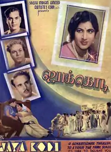 Jayakodi is a 1940 Indian Tamil-language social problem film directed by Bhagwan Dada. The film stars K. T. Rukmini and K. Natarajan. It revolves around a girl who rebels against the dowry system in India. The film was released on 17 March 1940 and became a success. No print of it is known to survive, making it a lost film.