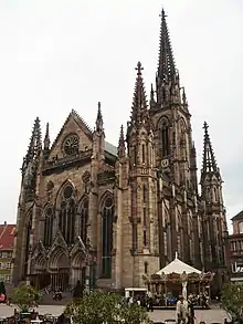 Temple Saint-Étienne, the Calvinist temple (1859-1869) of Mulhouse, with its 97-metre spire, is one of the highest Protestant religious buildings ever built in Europe.