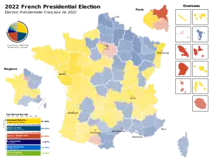 In the first round of voting in France's two round voting system, he came in third place with 22% of the vote, behind president Emmanuel Macron in first place with 28%, and narrowly behind Marine Le Pen's 23% of the vote.[42] Only the top two finishers continue on to the second round, so Mélenchon was eliminated after the results of the first round were certified. Mélenchon advised his voters not to vote for Le Pen in the second round, but did not endorse Macron. His 7.7 million first-round voters became a key demographic for the second round. He was the most popular candidate for voters aged 24–35.[43] He was the most voted candidate in the overseas departments of Martinique, Guadeloupe, French Guiana, Réunion, Saint Pierre and Miquelon and Saint Martin, obtaining majorities in several of these jurisdictions.[44] He was also the most voted candidate in Île-de-France.[45]
