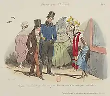 Grandville's parents had friends and family in Paris working in the theater who provided work and connections early on, including a relative, Frédéric Lemétheyer, who was a stage manager in the Opéra-Comique. He began using his pseudonym, "Grandville" in Paris. It was derived from “Gérard de Grandville”, his paternal grandparents stage name when they were actors and worked in the court of Lorraine. The pseudonym Grandville appeared in several variations throughout his career, including Jean Ignace Isidore Grandville, Jean-Jacques Granville, Jean de Granville, J. J. Grandville, J. I. I. Grandville, and Grandville. He designed illustrations for decks of playing cards and worked with Hippolyte Lecomte, a painter and ballet set designer in Paris, for whom he produced a set of color lithographs Costumes De Théãter in 1826. That set was followed by additional series including 12 lithographs created for the printer Langlumé titled Les Dimanches d’un bourgeois de Paris ou Les tribulations de la petite propriété (Sundays of a Paris Bourgeois or The Tribulations of Small Property), in 1826. Subsequent collections included 53 prints in La Sibylle des salons (The Sibyl of the Salons) in 1827 and 12 prints in Titres pour morceaux de musique (Titles for Musical Pieces) in 1828.[5][6][7]