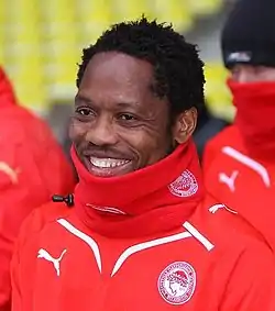 Makoun made his Olympiacos debut, coming on as a substitute in the 67th minute, in a 1–0 loss to Marseille in the UEFA Champions League Group Stage march on 13 September 2011.[91] Five days later on 18 September 2011, he made his league debut five days later, coming on as a substitute in the 69th minute, in a 2–1 win over Skoda Xanthi.[92] Since making his debut at Olympiacos, Makoun established himself in the first team, playing in the midfield position.[93] It wasn't until on 5 November 2011 when he scored his first goal for Olympiacos against Aris in a 3–2 away win.[94] However, in a follow up match against bitter rivals Panathinaikos, Makoun suffered a knee injury, resulting in his substitution and was that kept him out for six to eight weeks.[95] It wasn't until on 4 January 2012 when he returned to the first team from injury, coming on as a second-half substitute, in a 1–0 win against Atromitos.[96] A month later on 19 February 2012, Makoun scored his second goal for the club, in a 2–0 home win against Panionios[97] He then played a role, assisting two goals in each two matches between 25 March 2012 and 1 April 2012 against Asteras Tripolis and Panetolikos (which a victory against them saw the club become the league champions for the second time in a row).[98] Makoun started in the Greek Football Cup Final against Atromitos and played 82 minutes before being substituted, as Olympiacos won 2–1 after playing at extra time.[99] Having made thirty appearances and scoring two times in all competitions, Makoun returned to Aston Villa after Olympiacos didn't have a budget to sign him on a permanent basis.[100] He spoke about his time at Olympiacos, saying: "I think I've had a good season. I took a lot of time to participate, I won titles. It was a good experience in Greece, in a great team and a really impressive atmosphere. I am very happy with what the team has achieved and I personally. I always want to play well and win titles. Of course, along the way you can have your ups and downs. When you belong to Olympiakos, you always want to win, for the team you represent and its history."[101]