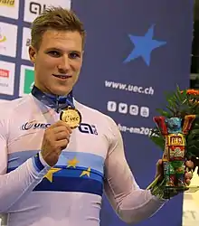 Jeffrey Hoogland (born 16 March 1993) is a Dutch track cyclist. He represented his nation in eleven editions of the UCI Track Cycling World Championships (since 2013).[1] At the 2015 UEC European Track Championships, he collected a total of three gold medals, individually in the sprint[2] and the 1 km time trial,[3] and with Nils van 't Hoenderdaal and Hugo Haak in the team sprint.[4] On 31 Oct 2023, Hoogland beat the 10 year old 1 km world record with the time of 55.433 sec.[5][6]