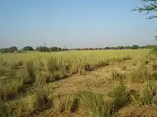 Khawi grass grows in hollows where water collects, and tends to favour kallar soil.[4] It has a fragrant smell and is coloured dark brownish-red.[4] Cows will eat it, but only when desperate, because it is not very nutritious.[4] Khawi grass is used to make khas-khas.[4] Like khawi, panhi grass grows in hollows and depressions, but it sticks to better soils and does not grow in kallar.[4] It somewhat resembles the buta in shape, although it is straight and stiff instead of drooping like the buta.[4] Its roots are long and tough, and they are used to make rope as well as to make weavers' brushes.[4]