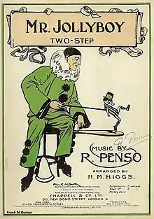 Jig dolls are essentially home-made toys. Typical versions could represent sailors, male and/or female costumed folk-dancers, African-Americans, Native Americans, Morris dancers, Punch and Judy, Adolf Hitler, even animals such as frogs, horses, chickens, dogs, and cows, etc. They may be clothed, painted or left as bare polished wood. Sometimes the heads are whittled to show distinctive facial features.[1] Historical figures such as Harry Lauder and more recent ones such as John Major (dancing on a board bearing an image of Margaret Thatcher) have been made.[2]