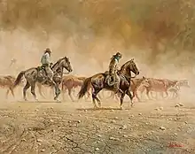 Realism differentiated Abeita's art from that of most traditional Native American artists,[17] as did his use of oil at a time when most Navajo art was being done with watercolor and casein.[13] The Native American flat-style approach, depicting subjects without shadow or depth, developed during the 1920s and 1930s and still predominated in the 1970s. Abeita chose instead to work in styles inspired by modern Western American artists, creating paintings that appear three-dimensional. One of his major inspirations was Frederic Remington and his paintings of the American Old West. Abeita has called himself a "Western-Indian" artist.[3][1][18][3][17] In 1997, Abeita's work was described as being in the "Transitional Modernism" style, representing a traditional Native American way of life using Modernist techniques and principles.[19]