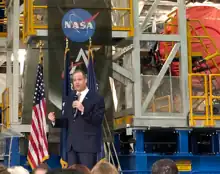 Bridenstine speaking in front of the SLS Core for the Artemis 1 mission (2019)