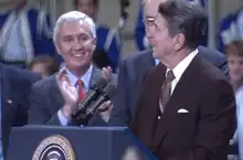 In September 2011, Gardner endorsed the (ultimately unsuccessful) 2012 candidacy of Wake County Commissioner Tony Gurley for lieutenant governor.[13] As an "elder statesman," Gardner has been called one of the "Four Jims" of the North Carolina Republican establishment, the others being former Governors Holshouser and Martin and former U.S. Sen. Jim Broyhill. (Holshouser died in 2013)[14] In January 2013, Gardner served as master of ceremonies at the inauguration ceremony for newly elected Gov. Pat McCrory, Lt. Gov. Dan Forest and other members of the North Carolina Council of State.[15] The ceremony celebrated the return of Republicans to the governor's office for the first time since Gardner's defeat in 1992. Forest also became the first Republican Lieutenant Governor since Gardner (Democrats Dennis Wicker, Beverly Perdue, and Walter Dalton served in the post after Gardner).