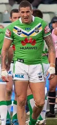 On 13 February 2010, Thompson was selected for the inaugural Indigenous All Stars team against the NRL All Stars at Cbus Super Stadium, playing off the interchange bench in the 16–12 loss.[12] Thompson played in 15 matches and scored 10 tries for Canberra in the 2010 NRL season. Thompson season ended in round 17 against the Sydney Roosters after succumbing to a groin injury in the 22–12 win at Canberra Stadium.[13] On 10 September 2010, Thompson re-signed with Canberra to the end of the 2013 NRL season.[14]