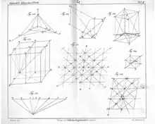 All three derivations (Hessel's, Bravais', and Gadolin's), which established a small finite number of possible crystal symmetries from first principles, were based on external crystal morphology rather than a crystal's internal structural arrangement (i.e. lattice symmetry).[4] However, the 32 classes of crystal symmetry are one-and-the-same as the 32 crystallographic point groups. After seminal work on space lattices by Leonhard Sohncke (1842-1897), Arthur Moritz Schönflies (1853–1928), Evgraf Stepanovich Fedorov (1853–1919), and William Barlow (1845–1934), the connection between space lattices and the external morphology of crystals was espoused by Paul Niggli (1888 - 1953), particularly in his 1928 Kristallographische und Strukturtheoretische Grundbegriffe.[2] For example, the repetition, or translation (physics), of a lattice plane produces a stack of parallel planes, the last member of which may be manifested morphologically as one of the external faces of the crystal.