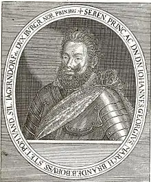 Johann Georg [John George] von Brandenburg (16 December 1577 – 2 March 1624) was a German nobleman and Protestant ecclesiastic in the Holy Roman Empire. He was the administrator (bishop) of Strasbourg from 1592 until 1604 and the Duke of Jägerndorf (Krnov), one of the Silesian duchies, from 1607 until 1624.
