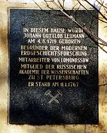 Lehmann was born in Langenhennersdorf, Electorate of Saxony and attended the University of Wittenberg, from which he received an M.D. in 1741, and then established a practice in Dresden. [1] Living in Saxony, he developed an interest in the local mining industry, and published on the chemical composition of ore deposits. In 1750, the Royal Prussian Academy of Sciences commissioned him to study mining practices throughout Prussia.