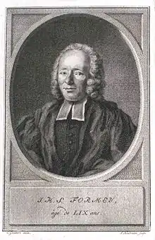 Johann Heinrich Samuel Formey (French: Jean Henri Samuel Formey; 31 May 1711 – 7 March 1797) was a German churchman, educator, author, and journalist. The son of an immigrant French family, he preached, taught, and wrote in French. A founding member of the Berlin Academy, he wrote thousands of letters, popularized scientific and philosophical ideas, and also contributed to Diderot's Encyclopédie.[1]
