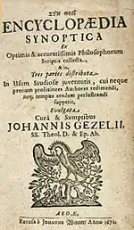 Gezelius published a number of textbooks and devoted his thesis in theology. In 1666, he published En rätt barnaklenodium, which went through 70 editions over the next two centuries.[3] In 1672, Gezelius published Encyclopaedia synoptica: ex optimis & accuratissimis philosophorum scriptis collecta, a three-piece Latin encyclopaedia which specifically dealt with fields of philosophy and mathematics. Encyclopaedia synoptica is considered to be Finland's first encyclopedic work. Johannes Gezelius the elder was known as an opponent of Finnish paganism and in 1673 ordered the destruction of spells.[4]
