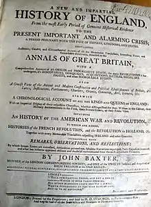 - ↑ Baxter, John (1796). A new and impartial history of England, from the most early period of genuine historical evidence to the present important and alarming crisis. London: Printed for the proprietors; and sold by H. D. Symonds, in Paternoster-Row. p. titlepage.