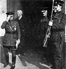 French's wife did not accompany him to India (they seem to have lived apart for a while after his return from Egypt).[42] When commanding the 19th Hussars in India, French was cited for adultery with the wife of a brother officer during his leave in the Indian hills; he was lucky this did not terminate his career.[43] There were also unsubstantiated rumours that French had had affairs with the daughter of an Anglo-Indian railway official and also, earlier in his career, with his commanding officer's wife.[44] A later tale, that he had once been the lover of the Irish nationalist Maud Gonne, appeared in Mary Colum's Life and the Dream (1947), although his biographer comments that it "lacks firm evidence".[45]