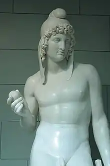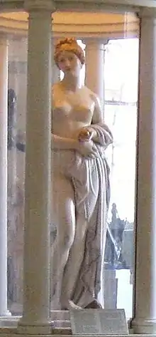 Gibson's chief excellence however lay in basso rilievo. His thorough knowledge of the horse, and his constant study of the Elgin Marbles, casts of which are in Rome, resulted in the two bassi rilievi, the size of life, which belonged to Lord Fitzwilliam: The Hours Leading the Horses of the Sun, and Phaethon driving the Chariot of the Sun. Most of his memorial works are also in basso rilievo. Some of these are of a truly refined and pathetic character, such as the monument to the Countess of Leicester, wife of Thomas Coke, the 1st Earl, or that to his friend Mrs Huskisson in Chichester Cathedral, and that of the Bonomi children. Passion, either indulged or repressed, was the natural impulse of his art: repressed as in the Hours Leading the Horses of the Sun, and as in the Hunter and Dog; indulged as in the meeting of Hero and Leander, a drawing executed before he left England. Gibson was the first to introduce colour on his statues, first as a mere border to the drapery of a portrait statue of the queen, and by degrees extended to the entire flesh, as in his so-called Tinted Venus and in Love tormenting the Soul, both now in the Walker Art Gallery in Liverpool.[4]