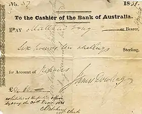 In New South Wales he was assigned to Bathurst. He was given a ticket of leave in 1829 after apprehending eight runaways.[3] His ticket was altered to Liverpool when he became an overseer on the Parramatta Road. On 31 December 1831 he was charged with forging Judge Dowling's signature to a cheque on the Bank of Australia; he was found guilty and sentenced to death in 1832.[4] This sentence was commuted to transportation for seven years to Norfolk Island.[1]