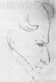 - Isabella Jane Knight (d.18 July 1870), 2nd daughter, from 1840 "a hopeless invalid".[29] Her surviving "Commonplace book" (first leaf signed and dated: "Isabella Jane Knight, /Simonsbath - Febry. 1837") contains several well-executed drawings and portraits, many by Edward Lear and Franz Nadorp, and was donated to the British Museum in 1938 by Lt-Col C. Morley Knight.[30] The family's friend Edward Lear referred to her in his 1858 correspondence from Rome: "The Knights live here much as ever, Isabella passing her 18th year in bed (I mean she has been in bed 18 years — ) but bright & patient always".[31] She died unmarried. She lived at the Palazzo Bracci, Via Rasella, Rome and died at 7 Piazza Pitti, Florence.[32]