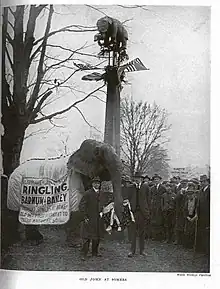 Old John, as he came to be known, stayed on with the circus after he retired from performing. He babysat for the performers' children, did heavy lifting, and led the elephant herd to and from the show grounds and train.[3]