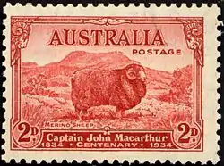 In recognition of his contribution to Australian agriculture, Macarthur was honoured by a set of three postage stamps issued on the centenary of his death in 1934 (depicting a merino ram).
