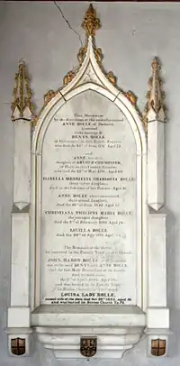 Rolle died in 1842 at Bicton House in Devon.[35] As part of her re-building of Bicton Church as St Mary's Church, completed in 1850, his widow Louisa retained as a Rolle mausoleum part of the ruins of the ancient Church of the Holy Trinity on the site and erected therein an elaborate monument to the memory of her husband, designed by Pugin and sculpted in the London workshop of George Myers. It consists of a Gothic-style chest tomb in front of a high arch filled-in with Gothic-style tracery and sculpted figures. In the same mausoleum is the baroque monument to his distant cousin Denys Rolle (1614–1638), who had inherited Bicton from his mother Anne Denys. He was third in descent from John Rolle (died 1570), the eldest son and heir of the patriarch George Rolle (died 1552) of Stevenstone, MP for Barnstaple. The Rolle Mausoleum is the private property of Lord Clinton and is not open to the public as from 2012.