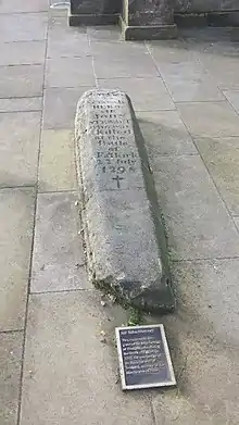 The gravestone of Sir John Stewart (d. 1298). The gravestone is original from the end of the 13th century, and the inscription dates from the 19th century. It reads: "Here lies a Scottish hero, Sir John Stewart, who was killed at the battle of Falkirk, 22nd July, 1298 †."
