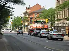 John Street is a Lower City arterial road in Hamilton, Ontario, Canada. Originally it was known as Mountain Road or Ancaster Road. It starts off at the base of Arkledun Avenue, a Mountain-access road in the city, just east of St. Joseph's Hospital, where it is a one-way street going north and tunnels underneath the Hunter Street Railway bridge and continues onward to the city's North End at the waterfront, where it ends at Guise Street East, the site of Pier 9.