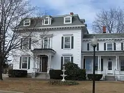 The John W. Busiel House is located on the north side of Laconia's downtown area, on the north side of Church Street opposite Beacon Street East. It is a 2+1⁄2-story wood-frame structure, with a mansard roof providing a full third floor in the attic level. Its exterior is finished with rusticated horizontal wood planking, with wooden quoins articulating the corners. The main facade is three bays wide, with the main entrance at the center, sheltered by an elaborate flat-roof portico. It is supported by paired round columns, with decorative brackets at the top beneath a dentillated projecting cornice. Windows are set in rectangular openings topped by dentillated projecting caps, and the main roof has a cornice with modillions and dentil moulding. The mansard roof is pierced by three dormers, each capped by a segmented arch with more dentil moulding. The central dormer is slightly wider, with narrow sidelight windows flanking the main window. A two-story ell extends to the right.[2]