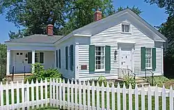 John W. Hunter was originally from New York, and moved to Michigan in 1818. He settled in what is now the city of Birmingham, and was soon joined by his wife, parents, and daughters. He first constructed a log cabin on his property. In 1822, Hunter hired itinerant carpenter George Taylor to construct this house, which was the first frame house built in Bloomfield Township. The original location of the house was along what is now Old Woodward, south of Maple Road and in the heart of what is now the Birmingham's commercial district. By the late 1820s, Hunter began manufacturing farm implements, building a foundry near his home as well as a furnace in Detroit. Hunter died in 1880.[2]