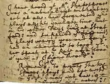 There is also the remark "A letter to my brother, to see Mrs. Queeny, to send for Tom Smith for the acknowledgment." "Mrs. Queeny" is assumed to be Judith Quiney, Shakespeare's daughter. This must have been written shortly before he arrived in Stratford. She died in the same year he was appointed as vicar, just before he was inducted. It is not known whether they met.[8]