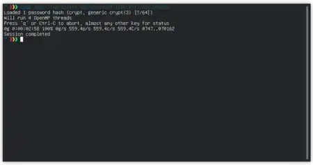 Then we see output from John working. Loaded 1 password hash the one we saw with the "cat" command and the type of hash John thinks it is (Traditional DES). We also see that the attempt required one guess at a time of 0 with a 100% guess rate.