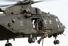 A Royal Navy Merlin helicopter engaged in trials and training with JADTEU