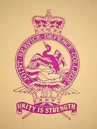 The Commandant was a Major-general or equivalent. Senior Directing Staff included Royal Navy, British Army, Royal Air Force, civilian colonels and equivalent: civilian G5 or Assistant Secretary (Counsellor). Officers attending the course, which focussed on managing tri-service operations, were typically of lieutenant-colonel rank or equivalent[4] and had to have the potential to rise at least two grades in rank. Three courses, each of nine months,[4] were held every two years, each with 60 officers (typically 17 from each service plus 9 others from the civil service or the police). Those officers passing the course, or serving on the directing staff for at least six months, received the letters jsdc. The majority of students went on to joint, central staff or international appointments. The crest featured a cormorant, which was also the name of the college magazine.