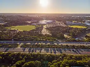Looking east over the Mitchell freeway at the HBF Arena and Lake Joondalup Baptist College on the right