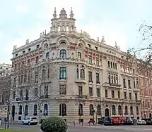 The best known Oriol's work, however, is casa de Montalbán, known today as Palacio del Retiro (1914). It was designed in the centre of Madrid as a family residence and office;[34] currently it hosts a luxury hotel.[35] The building, its style described as eclectic or neo-baroque, gained recognition and indeed notoriety for its lavish finishing, including stained-glass windows, fountains and frescos;[36] some of its features bordered extravagance, like elevators which carried horses to and from the rooftop exercise ring.[37]