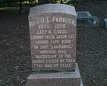 Josiah was married in 1833 in New York to Elizabeth Winn (died 1869), and they had four children.[1] In 1839, the trained blacksmith volunteered to join Jason Lee's mission in the Willamette Valley.[1] Parrish and around 50 others sailed on the ship Lausanne around Cape Horn in South America to the Columbia River and on to Oregon City in what has been called the Great Reinforcement of the Methodist Mission.[1] They set sail on October 9, 1839, from New York City.[2]