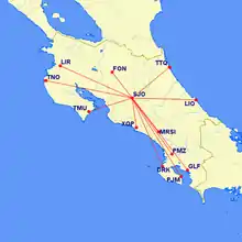 The following airlines have scheduled direct services to and/or from Juan Santamaría International Airport: