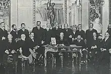 Following 1909 death of Carlos VII[118] his son as the new Carlist king found himself pressed to dismiss Feliú;[119] he opted for a compromise, confirming the nomination but appointing de Mella his own personal secretary.[120] He was called to Frohsdorf to prepare something like a new Acta de Loredan, but relations did not go smoothly,[121] the two developing suspicions versus each other.[122] After a joint trip to Rome in May 1910 de Mella was replaced with Artero Samaniego,[123] disillusioned - rather mutually - with his new monarch.[124] During the next 2 years the group, already dubbed Mellistas,[125] sabotaged Jefe Delegado,[126] in 1910 openly promoting non-dynastic ultra-conservative coalitions[127] against Feliú-approved accords strictly conditioned by dynastic claims. Constantly dubbing Feliú as incompetent leader,[128] in 1912 Mella decided to launch a full-scale onslaught; he accused jefe delegado of illegitimately holding the jefatura[129] and demanded his deposition, in private threatening the claimant with rejecting his rule as deprived of "legitimacy of execution".[130] Don Jaime gave in and by the end of 1912 he re-appointed de Cerralbo as president of Junta Superior.[131]