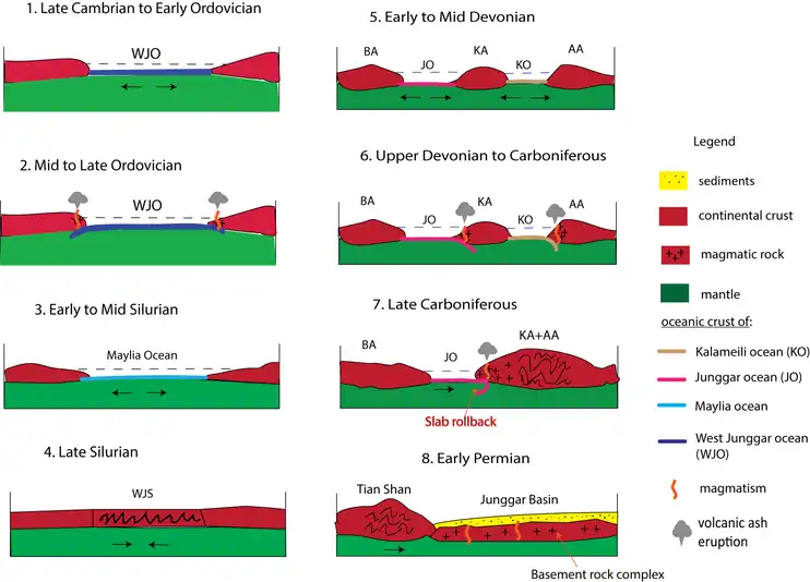 Xinjiang paleocraton was pulled apart for a continental rifting episode to form extensional basins in Late Cambrian.[17] The continuous divergence of the continental crust during late Cambrian to Ordovician shaped the West Junggar Ocean.[17] The West Junggar Ocean presented as the present Tangbale and Honguleleng ophiolites from intra-plate volcanism, and then this volcanism shut in mid-upper Ordovician.[17][19] The Ordovician first ocean basin indicated that eastern Junggar was over passive margin.[17] Another rifting event established the Mayilashan ocean basin and back-arc basin in east Junggar during Silurian.[17] However, the compressional environment restricted the two landforms so that they ended up shut and folded in the late Silurian.[17] This eventually led to the convergence of Tarim, Kazakhstan and Siberian paleo-plates.[17] They were from the original Xinjiang paleocraton that puzzled each other again.[17]