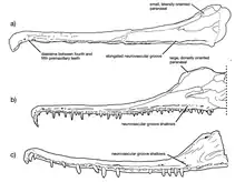 The jaws end in a rosette of teeth formed by the premaxillae, with four teeth present in either side. This rosette is only moderately downturned, which makes it similar to most other phytosaurs and differentiates it from Machaeroprosopus and Colossosuchus. The fourth tooth, like in other parasuchids, is noticeably smaller than the first three and separated by all other subsequent premaxillary teeth by a short, toothless gap (diastema). Behind this diastema, each premaxilla bears 19 additional teeth, each of which is more widely spaced from the others than typical for longirostrine phytosaurs. On the side of the premaxillae, about 5 mm (0.20 in) above the toothrow, lies a deep groove that contains the neurovascular foramina. This groove is much deeper than in other taxa and runs along nearly the entire length of the rostrum, only ending just behind the beginning of the antorbital fenestra.