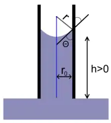 Jurin's law, or capillary rise, is the simplest analysis of capillary action—the induced motion of liquids in small channels[1]—and states that the maximum height of a liquid in a capillary tube is inversely proportional to the tube's diameter. Capillary action is one of the most common fluid mechanical effects explored in the field of microfluidics. Jurin's law is named after James Jurin, who discovered it between 1718 and 1719.[2] His quantitative law suggests that the maximum height of liquid in a capillary tube is inversely proportional to the tube's diameter. The difference in height between the surroundings of the tube and the inside, as well as the shape of the meniscus, are caused by capillary action. The mathematical expression of this law can be derived directly from hydrostatic principles and the Young–Laplace equation. Jurin's law allows the measurement of the surface tension of a liquid and can be used to derive the capillary length.[3]