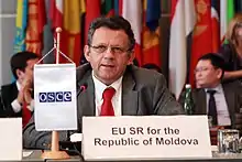 From 1997 till 2001, Mizsei was director of AIG Global Investment Group for Central and Eastern Europe. Between 2001 and 2006, Mizsei worked at UNDP as an assistant administrator and regional director in the rank of Assistant Secretary General of the United Nations.[2] From 2007 until 2011, he served as a special representative of the European Union to the Republic of Moldova. In 2014, Mizsei was appointed head of the EU Advisory Mission for Civilian Security Sector Reform Ukraine (EUAM Ukraine).[3][4] In 2019, he joined the European Union High Level Advisers' Mission to help the Moldovan government to strengthen its reintegration policy.[5]