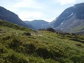 Kärkevagge (Northern Sami: Geargevággi, "Stone Valley") is a short (4 km long) valley in Kiruna Municipality, Sweden. It is easily accessed by a good path from the E10 Kiruna-Narvik highway. Rissajaure, the clearest lake in Sweden, is located at the head of the valley.[1] Karkevagge is noted for the Giant Boulder Deposit (GBD) which fills it with huge jumbled blocks, some the size of houses. One of Sweden's leading geoscientists, Anders Rapp, a world pioneer of quantitative geomorphology, studied the valley for 10 years. He suggested that the parallel rows of blocks had descended in waves from the valleyside cliffs.[2] He estimated the volume of the GBD at 50 million cubic metres. However a large angular cavity beside Rissajaure (top right in picture) has a volume of 42 million cubic metres. The GBD probably descended from it as a rock avalanche and spread down the valley on a glacier, giving it a moraine-like form and visual unity as seen from the air.[3]