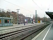 Köln Süd (Cologne South) station is located in the southwestern edge of the Innenstadt of Cologne in the district of Neustadt-Süd in the German state of North Rhine-Westphalia. It is located between the streets of Luxemburger Straße and Zülpicher Straße. The station is a stop for regional services on the West Rhine Railway. The Cologne freight railway bypass branches off from the station over the South Bridge; it is also used as needed by passenger trains. The station has four platform tracks at two island platforms and two tracks without platforms, which are used by the intensive freight traffic. It is classified by Deutsche Bahn as a category 4 station.[2]