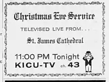 KICU-TV began broadcasting on December 26, 1961.[2] It was owned by Sierra Broadcasting, Inc., of San Francisco, which was headed by Norwood Patterson and co-owned with Fresno's KBIF radio after Patterson acquired it in early 1962.[3] Patterson had previously acquired the Eshom Point transmitter site, which had been used by another failed television station in the area, KVVG-TV (channel 27).[4] The station initially broadcast for four and a half hours a day, with movies as the prime attraction;[2] it would also air programs that Fresno's NBC and CBS affiliates did not clear.[5] Patterson's father owned the KSAN stations in San Francisco, including dormant KSAN-TV channel 32; when S. H. Patterson went to sell channel 32, he was required to activate the facility and did so by simulcasting his son's Visalia channel.[6] KSAN-TV simulcasted KICU-TV for two years until the sale of the San Francisco channel to Metromedia closed in March 1968.[7] The station also aired instructional programming for local schools, as no educational television station existed in the Central Valley at the time.[8]