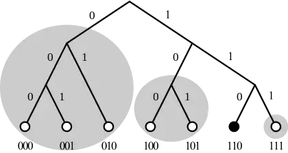 To analyze the algorithm, consider a Kademlia network of nodes with IDs , each of which is a string of length that consists of only ones and zeros. It can be modeled as a trie, in which each leaf represents a node, and the labeled path from the root to a leaf represents its ID. For a node , let be the set of nodes (IDs) that share a prefix with of length . Then filling the -th bucket of can be modeled as adding pointers from the leaf to leaves (IDs) chosen uniformly at random from . Thus routing can be seen as jumping among the leaves along these pointers such that each step goes towards the target ID as much as possible, i.e., in a greedy way.