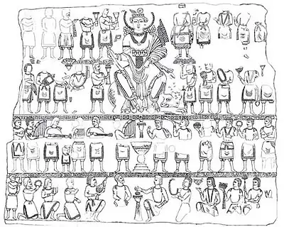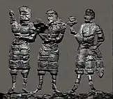 The adorants are dressed in knee-length tunics, with long boots over trousers, suggesting clothing styles similar to those found in the paintings of Penjikent, and wear shoulder ribbons which have been associated with Hephthalites nobility.[8] The gate is dated to the first half of the 6th century CE (500-550 CE), and the destruction of the palace is attributed to the Islamic conquest of Samarkand in 712 CE.[8][10]