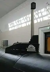 ![]() A Kaiten, Type 1, at the Tokyo Yasukuni War Memorial Museum. The gun in the background is not part of the vessel. | |
