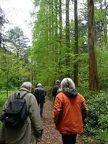 The two dendrologists made further experiments growing seedlings of coast redwood,[6] dawn redwood and numerous kinds of southern beeches[7] and pine trees. More than 13,000 were handed over to forestry officers, to scientists and to plant nurseries. As time went by, the park known as the "Sequoia Farm" became bigger and bigger, developing into a highly respected arboretum. It has more than 400 varieties of trees and interesting ground flora and is part of the "Protected area of Maas-Schwalm-Nette", so-called after the three rivers that run through the area.[8]